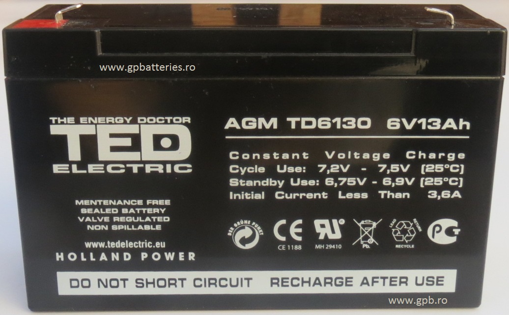 Sumar: Acumulator etans stationar VRLA 6V 13Ah marca TED borne F1 de 4,8mm latime, dimensiune 151mm x 50mm x h94mm